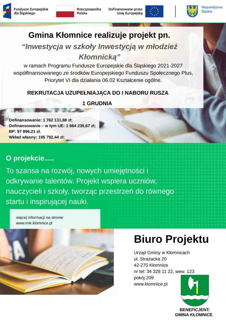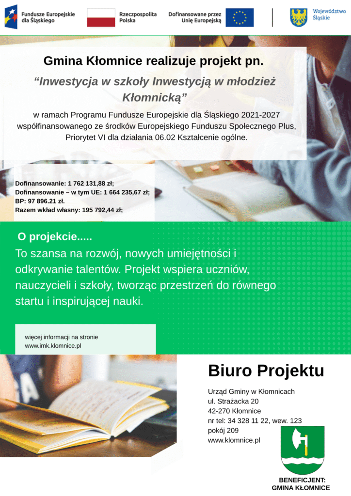 Gmina Kłomnice realizuje projekt pn. „Inwestycja w szkoły Inwestycją w młodzież Kłomnicką” współfinansowany ze środków Europejskiego Funduszu Społecznego Plus w ramach programu Fundusze Europejskie dla Śląskiego 2021–2027, Priorytet VI, działanie 06.02 Kształcenie ogólne.